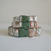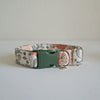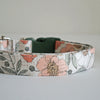Introducing the Vintage Floral Dog Collar! Add a touch of timeless charm to your furry friend’s look with our Vintage Floral Dog Collar. This collar features an elegant look of floral design. Features a cream background fabric with pops of coral, white and dark green floral designs, silver details and a forest green buckle.